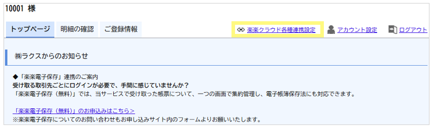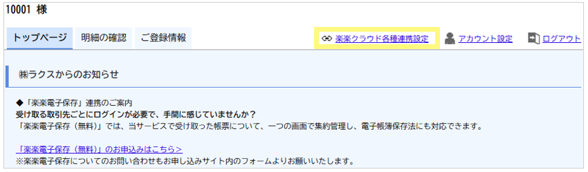 <「楽楽明細」マイページ :「楽楽電子保存 連携設定」画面>