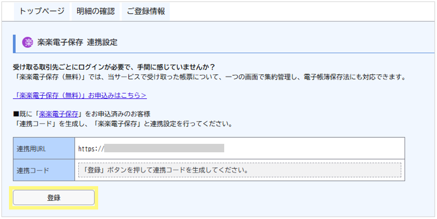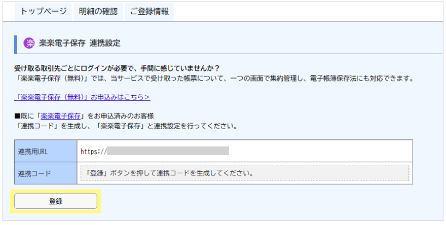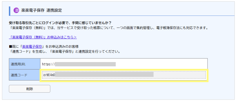 連携コードを削除した場合は、再度「楽楽電子保存」側の設定(前項の手順③以降)を実施してください。