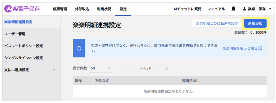 ⑤画面左側「楽楽明細連携設定」>画面右上「新規追加」をクリック