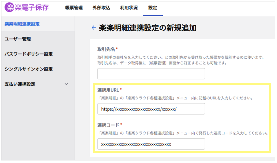 | 連携コード | 「楽楽明細」の「楽楽クラウド各種連携設定」画面で生成した「連携コード」を入力してください。 ※「楽楽明細」上に表示されている「連携コード」の値と、「楽楽電子保存」側に入力する「連携コード」の値が必ず一致するように入力してください |