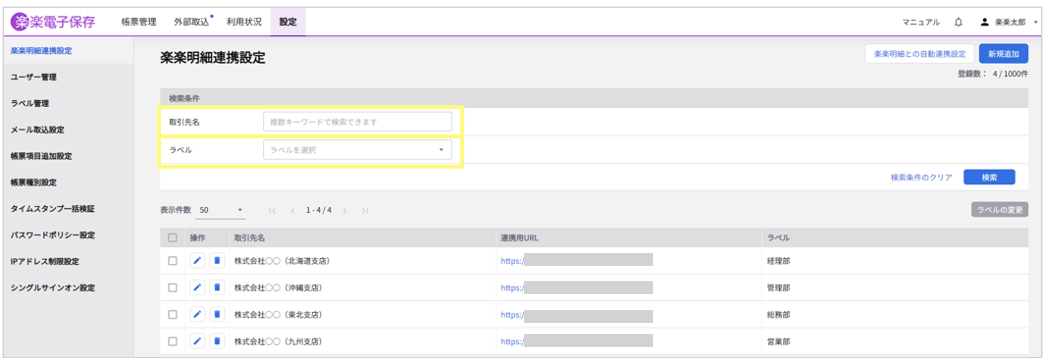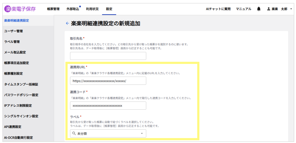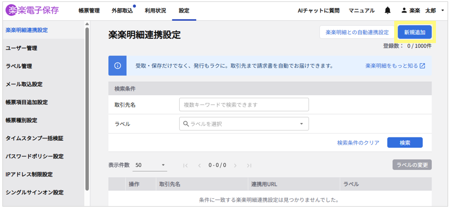 <「楽楽電子保存」 :楽楽明細連携設定の新規追加 画面>