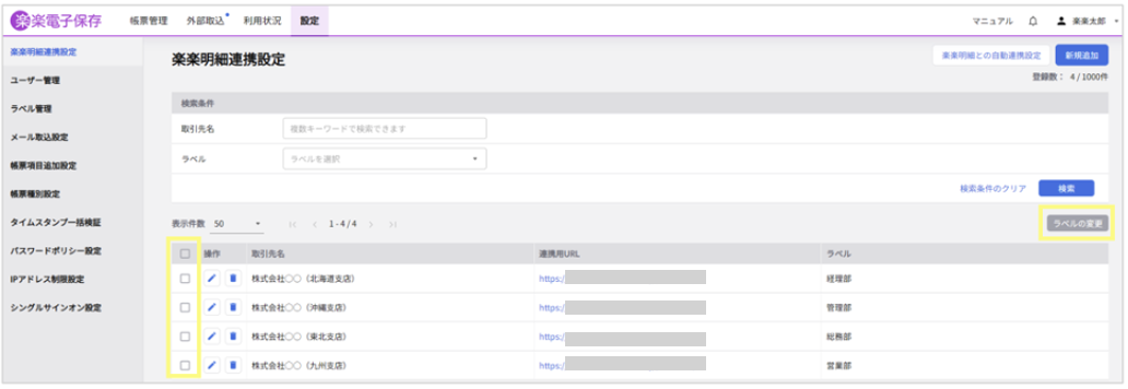 楽楽明細連携設定に紐づいているラベルを一括で変更することができます。